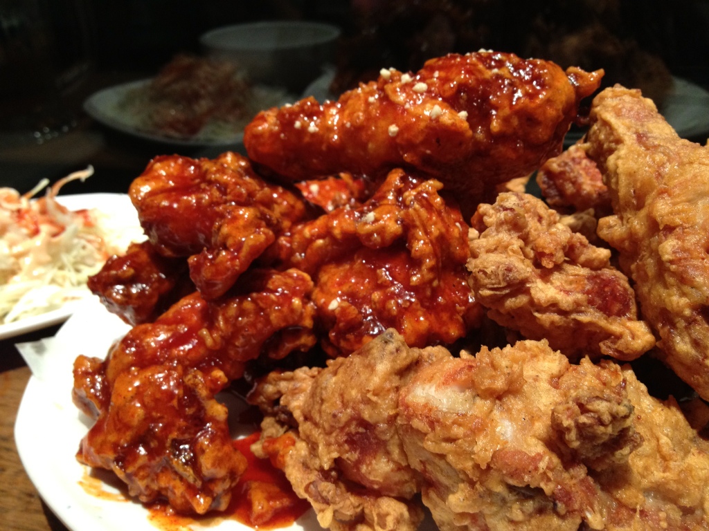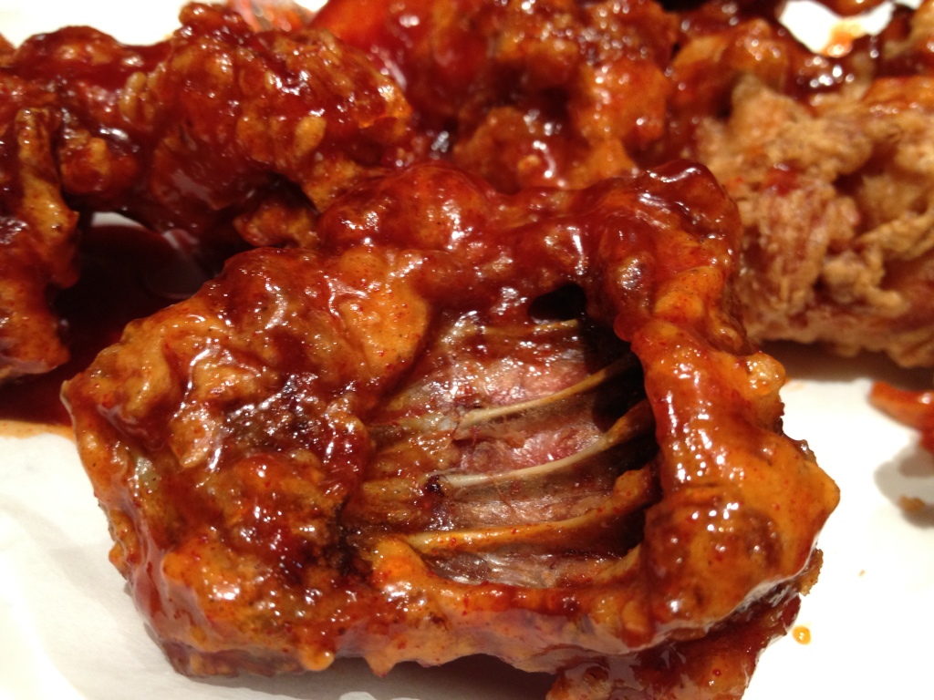 The skin was tougher to bite through so it came off in bigger chunks. The breading was the good ol Korean crispy style breading. It wasnt flavorful but evenly coated. The spicy pieces were cooked the same as the original style but were covered with a spicy sweet sticky sauce that the chick thought was heavenly.