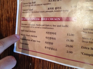 The menu is varied, and most of the patrons were there for Korean BBQ. The chicken was prominent on the left, so our choice was quickly made. We were intrigued by the Dragon Chicken with Cheese, but were determined to stay focused, maybe next time.