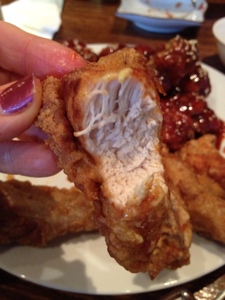 The sweet chili chicken was very saucy and not that spicey, but it had a lovely sweetness and was a bit more chewy than the original. The Original was not seasoned heavily and let the chicken flavor and crispy skin shine through.