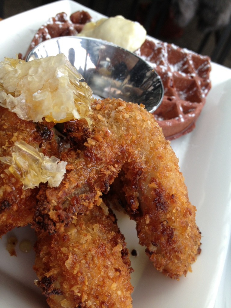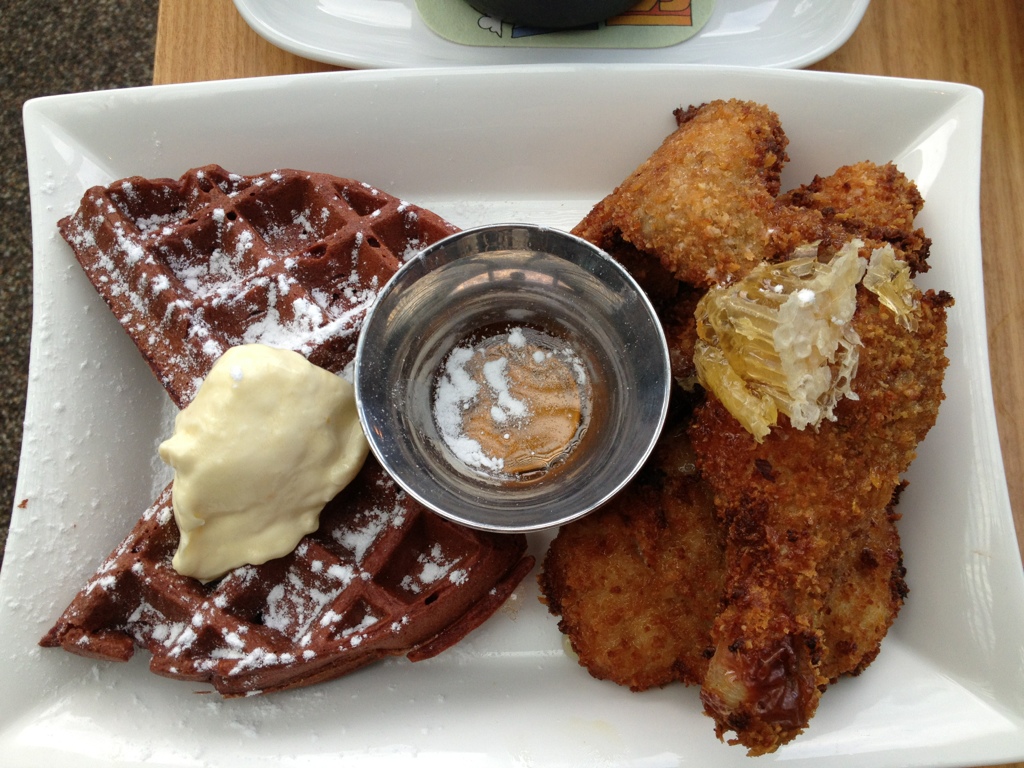 The food arrived quickly given the crowds! The chicken order consisted of 4 chicken pieces topped with a decorative bit of honey comb accompanied with chocolate waffles covered in a lemon cream and with a honey dipping sauce.