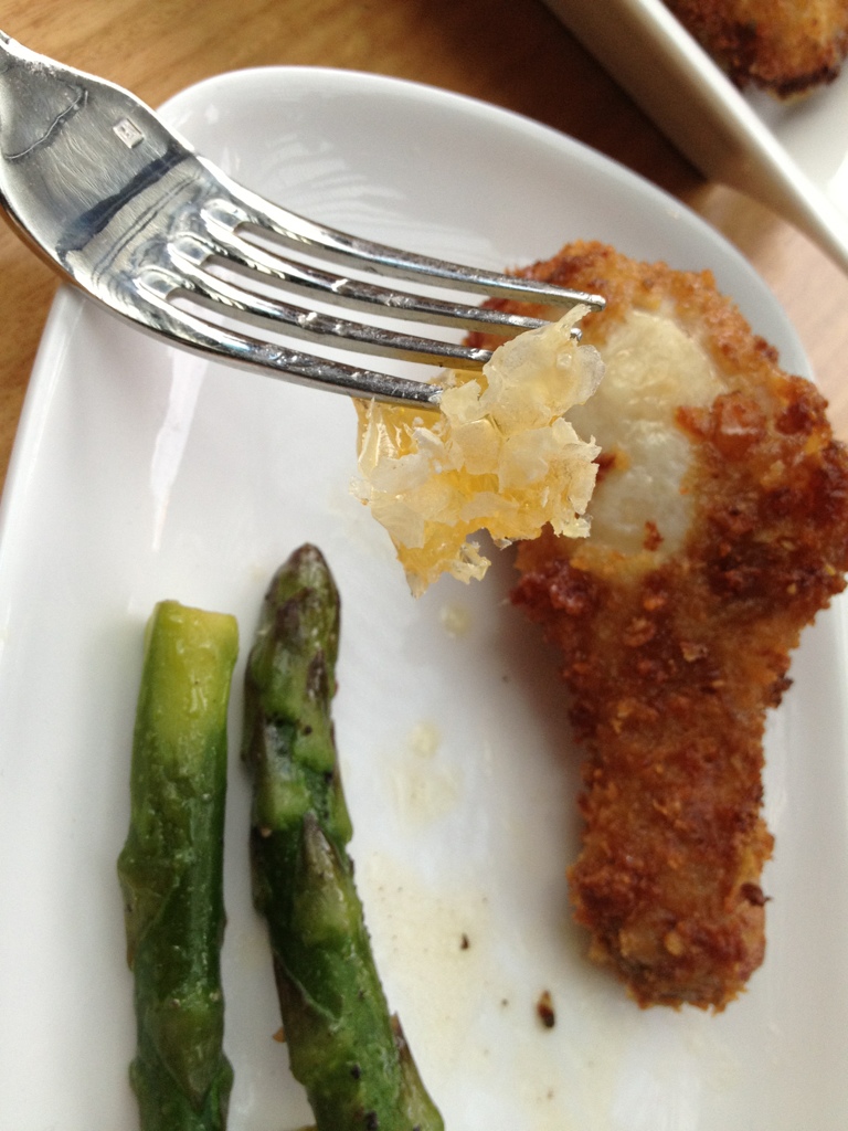 The mashed potatoes were good, creamy and had a peppery flavor which sat well with Hollywood especially as a sauce to dip the chicken in. The steamed asparagus was nice and added a fine healthy balance as long as you ignore the buttery sauce over it.