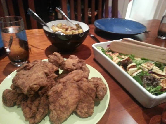 Dizzy supplied the roasted potatoes and a perfectly prepared Halumi salad to complement the main. Since we are all extra careful cooking chicken, we may have kept them in the fryer too long. So some of the pieces were just a little bit dry but that didnt stop us from smashing all the chicken.