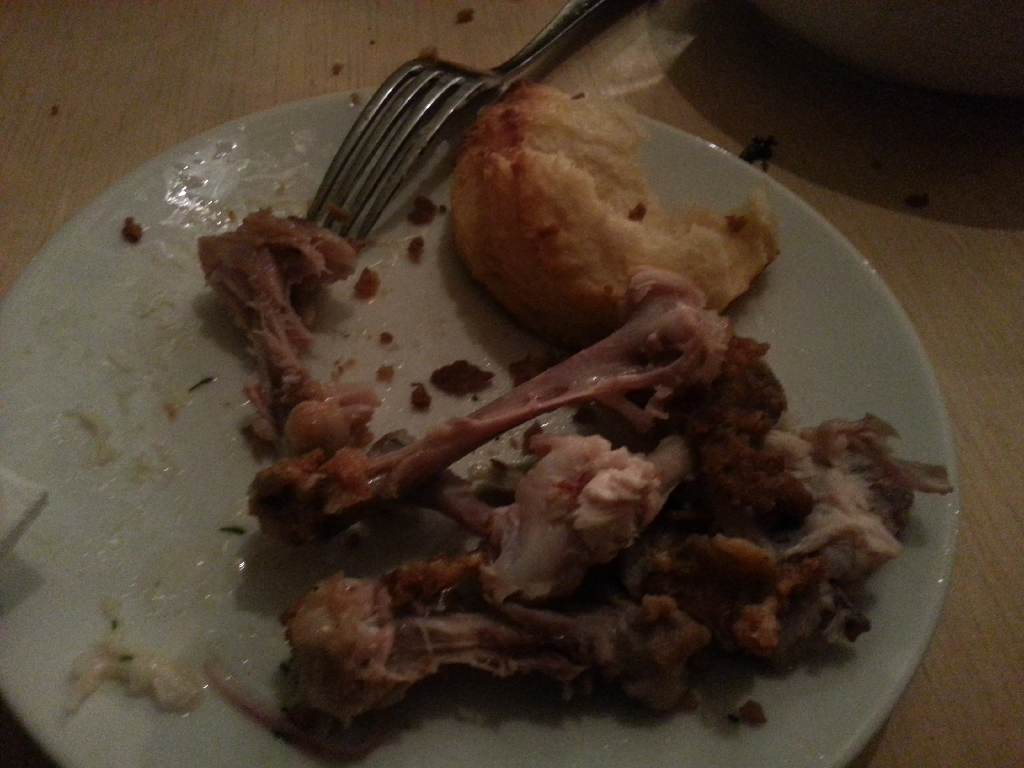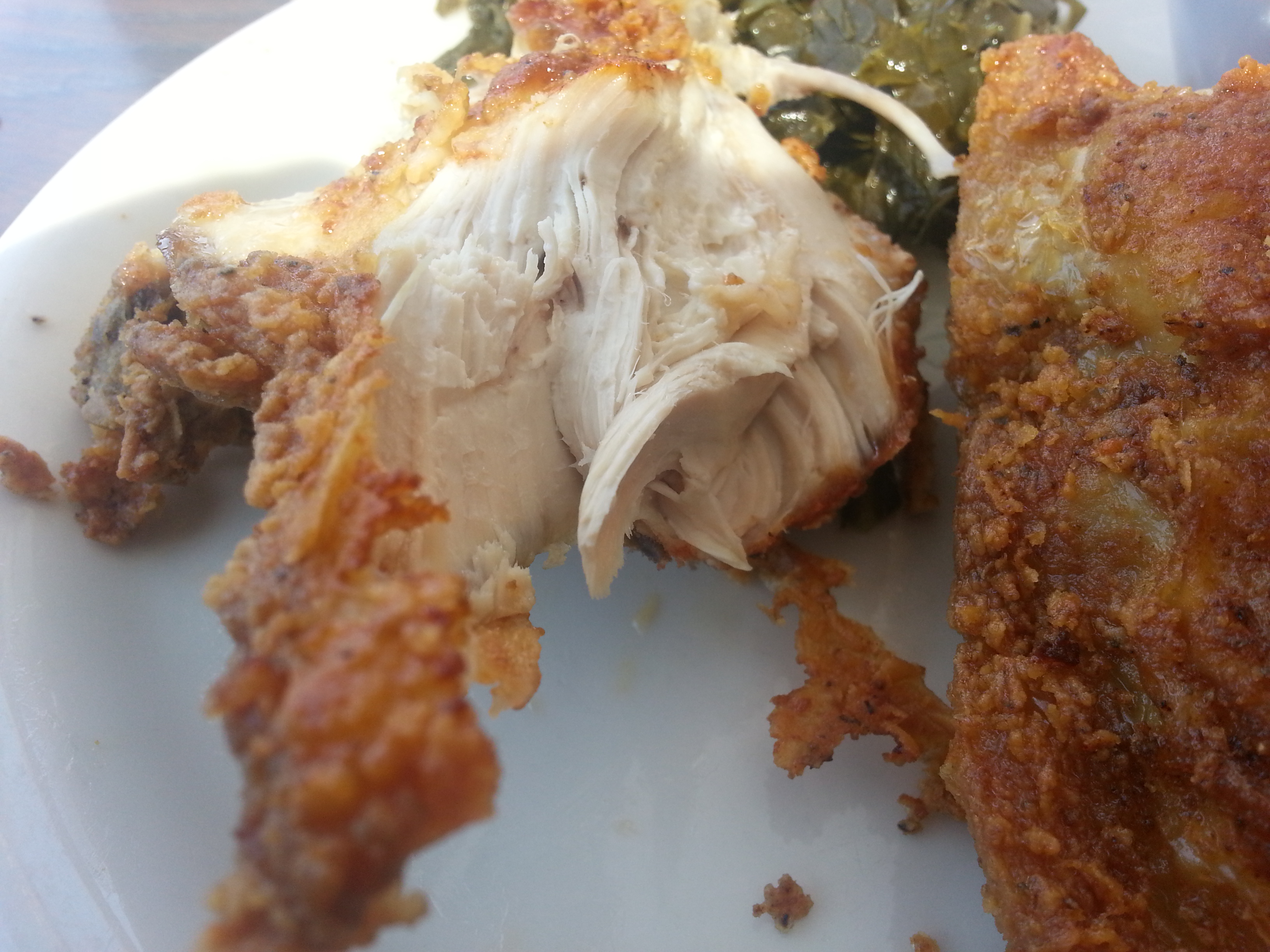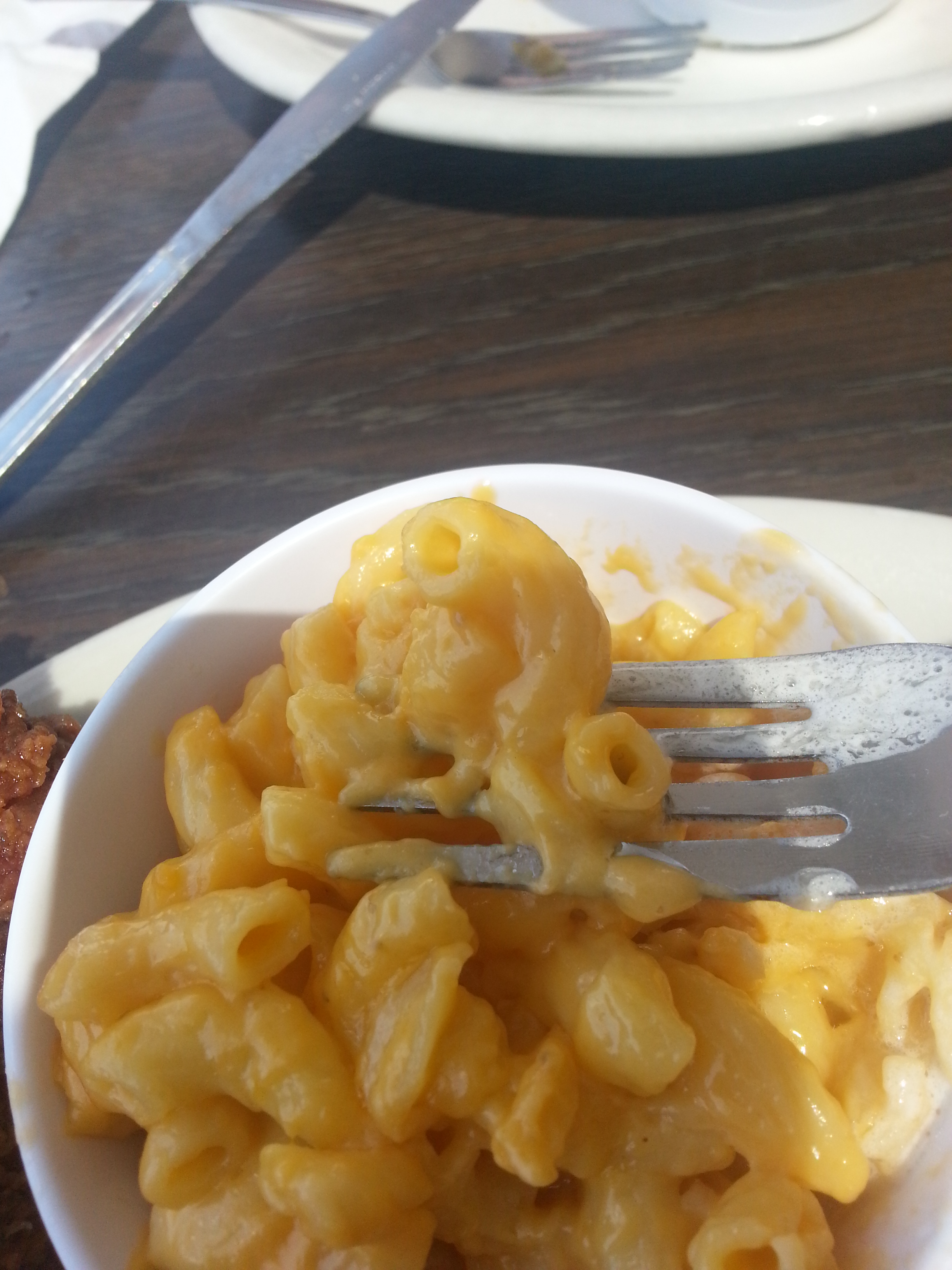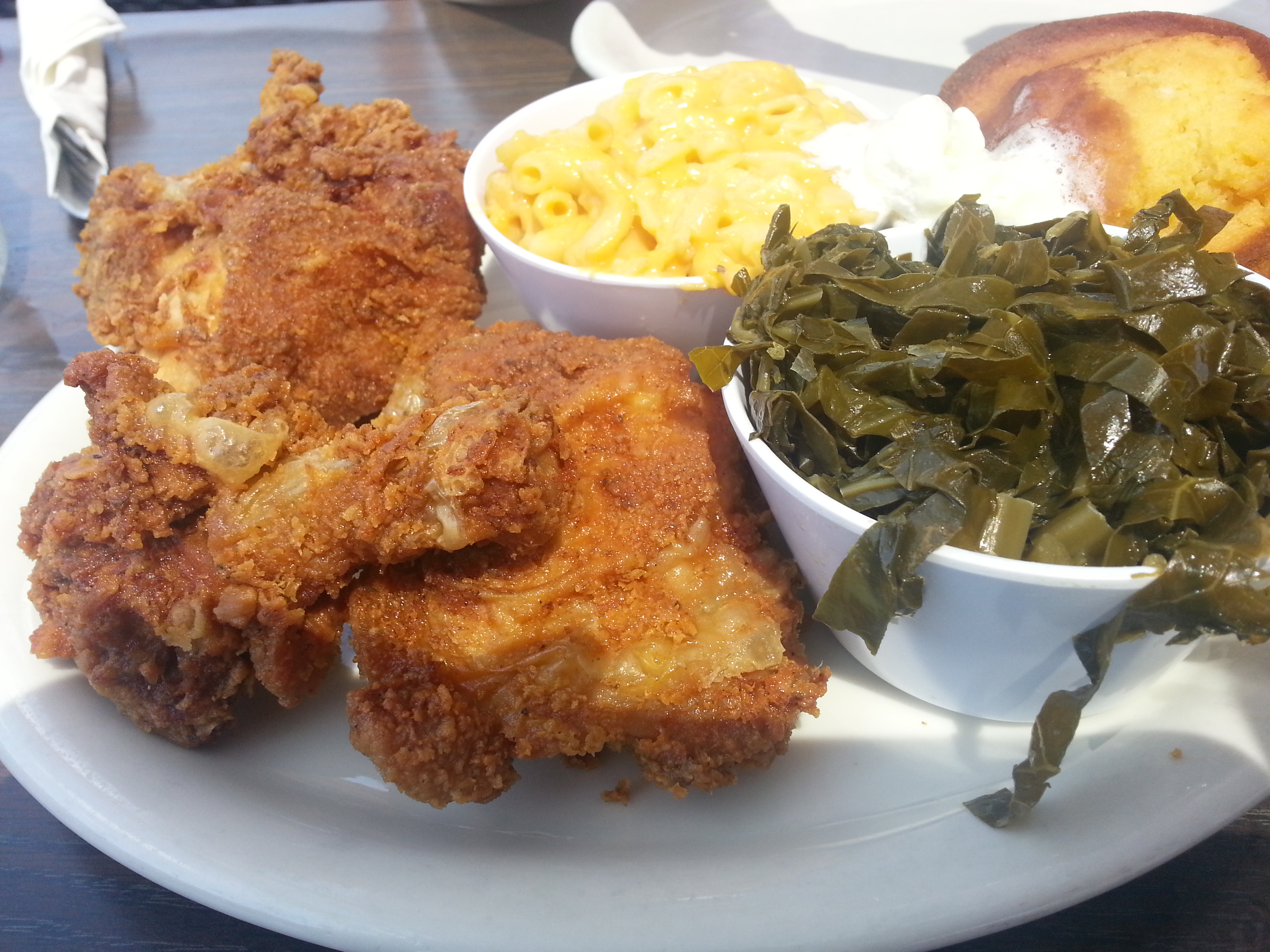 We arrived in the middle of a scorching summer day and found that the place was packed. We accepted outdoor seating, and we were the only ones brave enough to eat without air conditioning. Hollywood ordered 3 pieces of southern fried chicken, with sides of mac n cheese, collared greens, and corn bread with whipped butter. Drinks came in large canning jars with plenty of ice. The Chick decided to share rather than face an American portion solo.