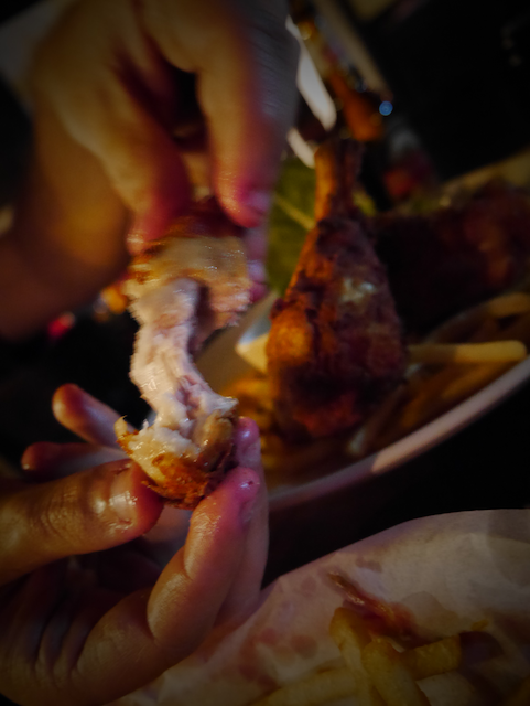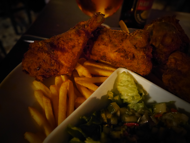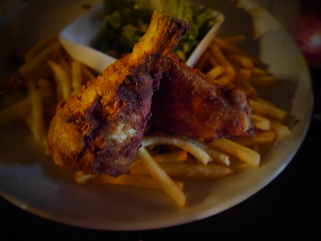 The main contender arrived next in a big basket with a huge bed of fries a bowl of pico de gallo salad and a mix of thighs and drumsticks of some crispy fried chicken. The chicken was fresh, hot and steamy. It was also very tender and had a prominent blend of spics that we really enjoyed. The coating/skin was single coated and spiced right. Hollywood is usually a fan of the double coating but found this style quite right. The only beef Hollywood had with this chicken is that there weren’t any breast/wing pieces. The accompanying salad was good and provided a contrasting fresh flavor.