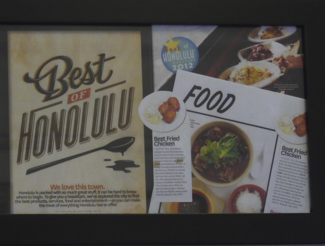 Ray’s is located on North King St in Honolulu in a very local neighbourhood with no parking. It’s a hole in the wall with humongous portions sizes. The menu on the wall boasts the best of diner fare: greasy breakfast plates, steaks, ribs, burgers, ahi tuna steaks, a lobster special, and of course – fried chicken. There were options for family-sized buckets, but we opted for a single serving.
