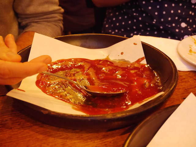 The kimchi was served in little jars and not as spicy as we’d hoped. The dumplings were served up hot and fresh, a tasty pre-chicken morsel. The grilled meats were ok, the Super Spicy Cheesy Chicken Sizzle was addictive, but the Fried Chicken stole the show.