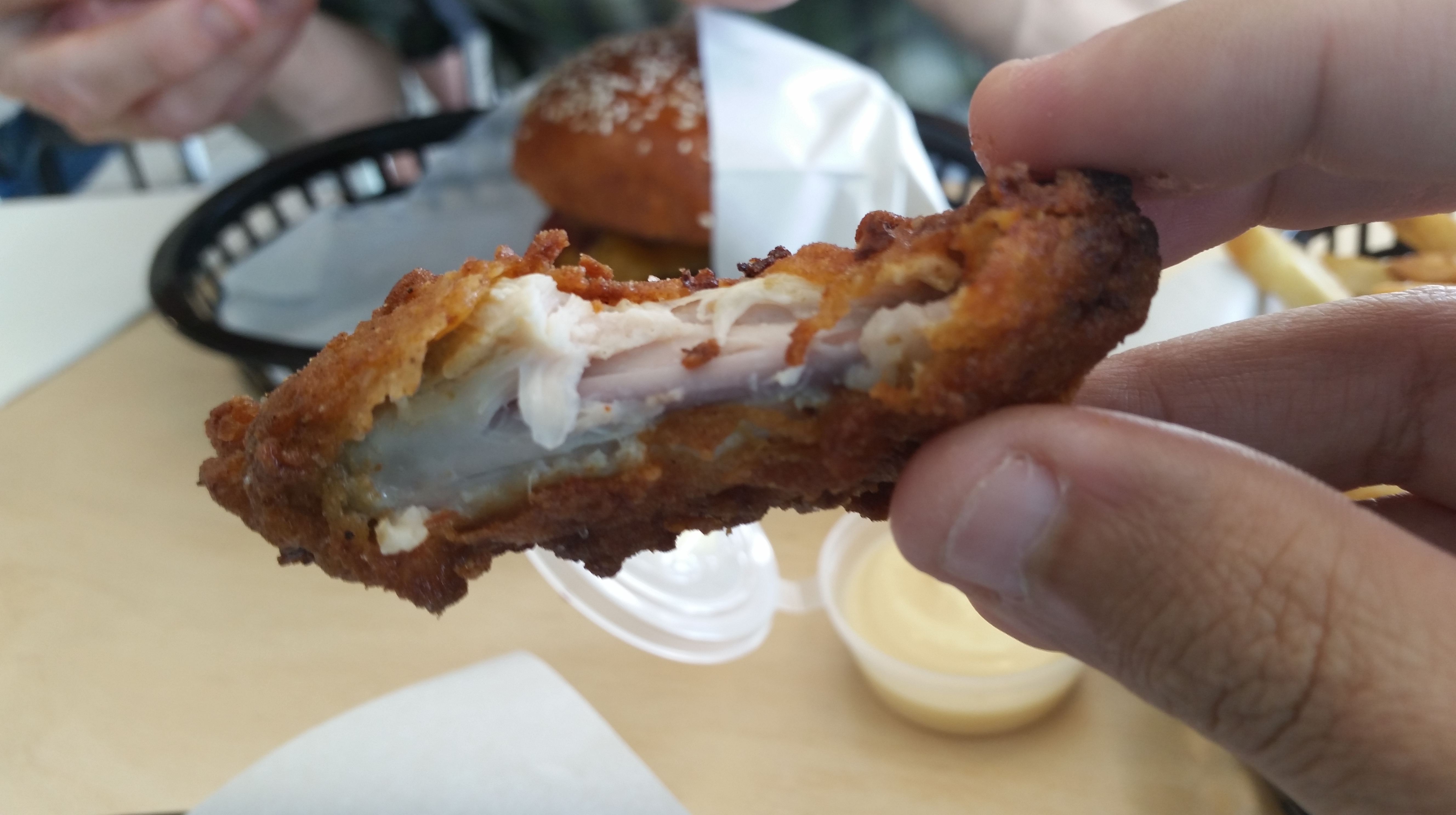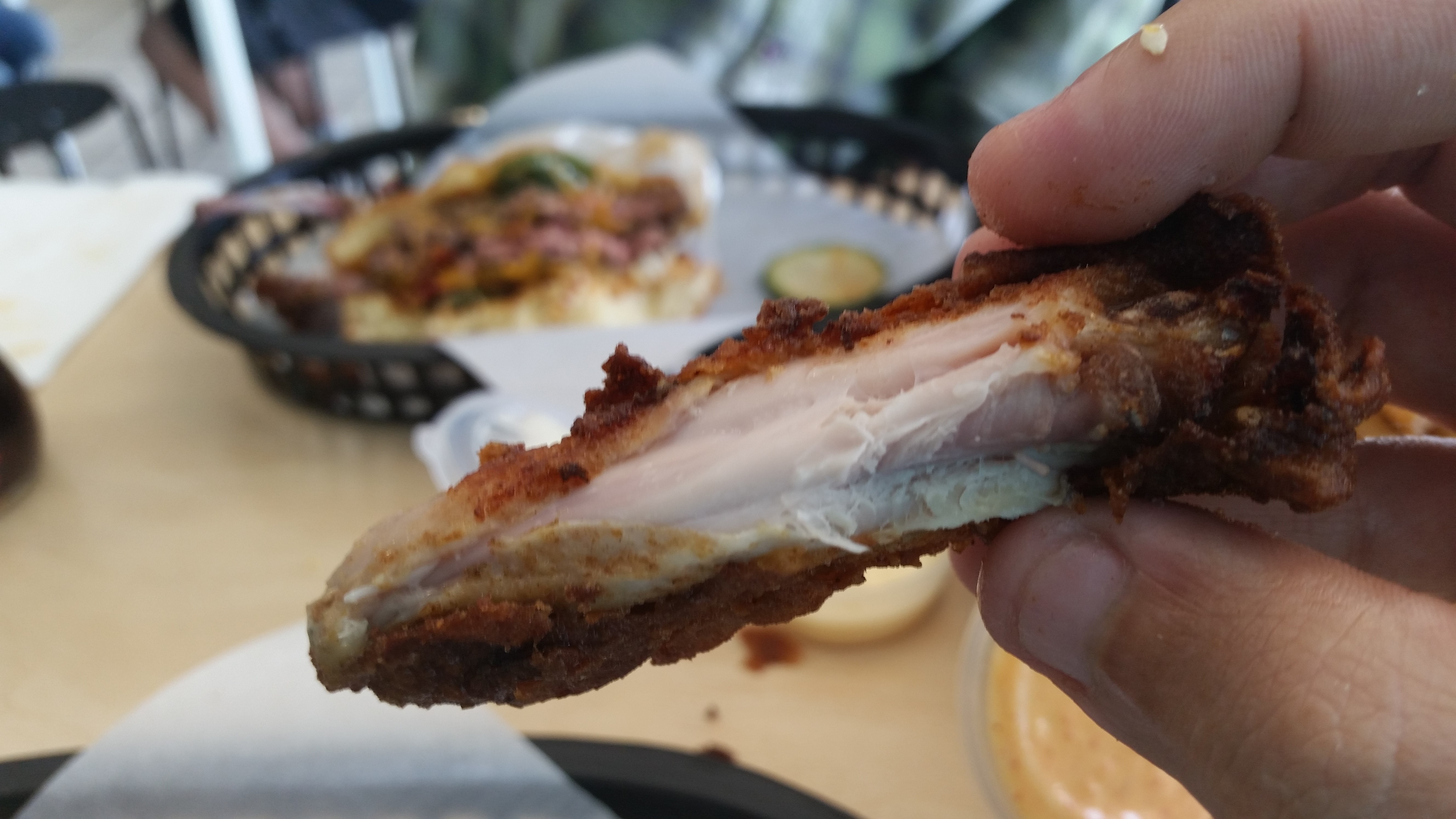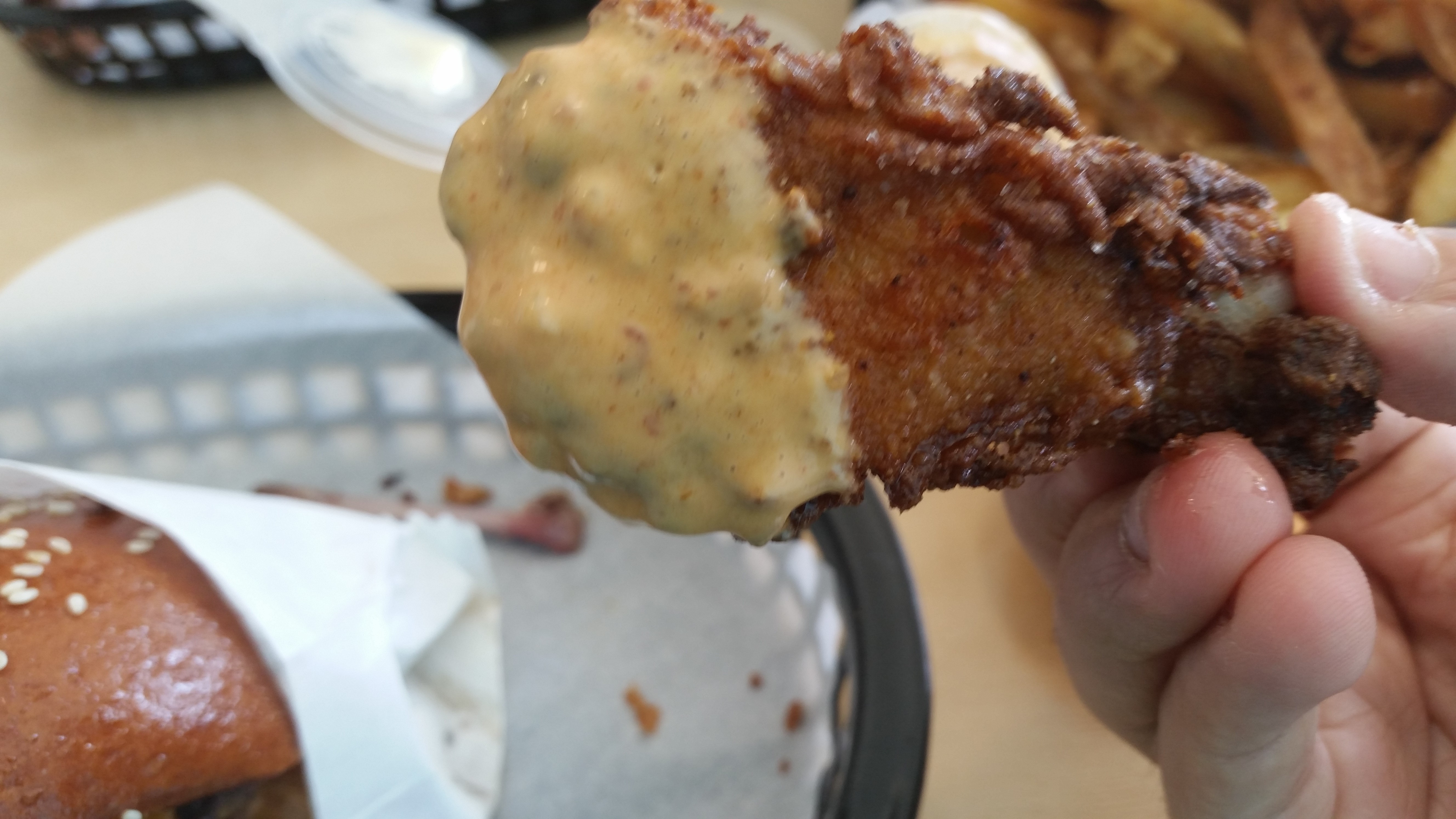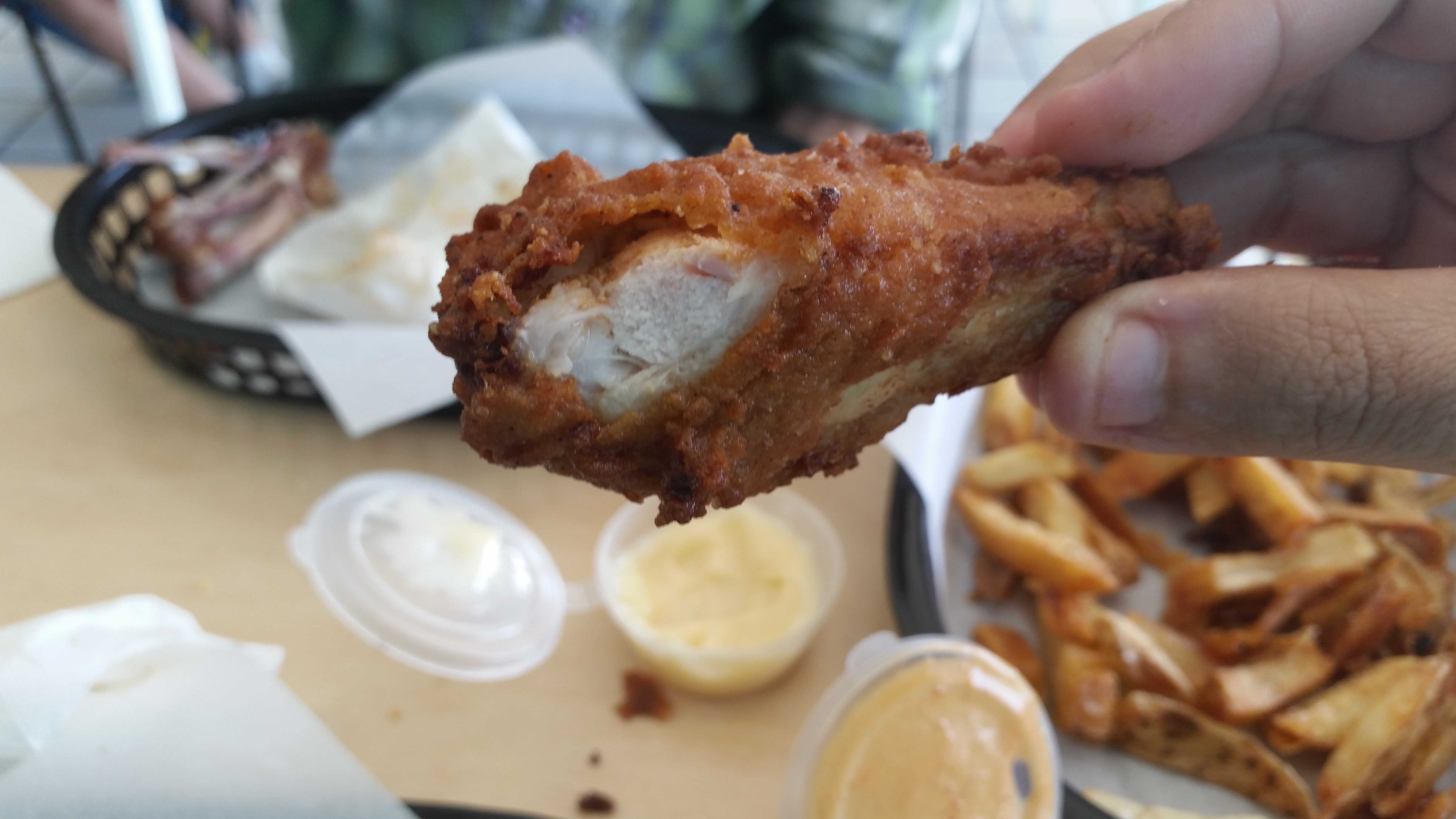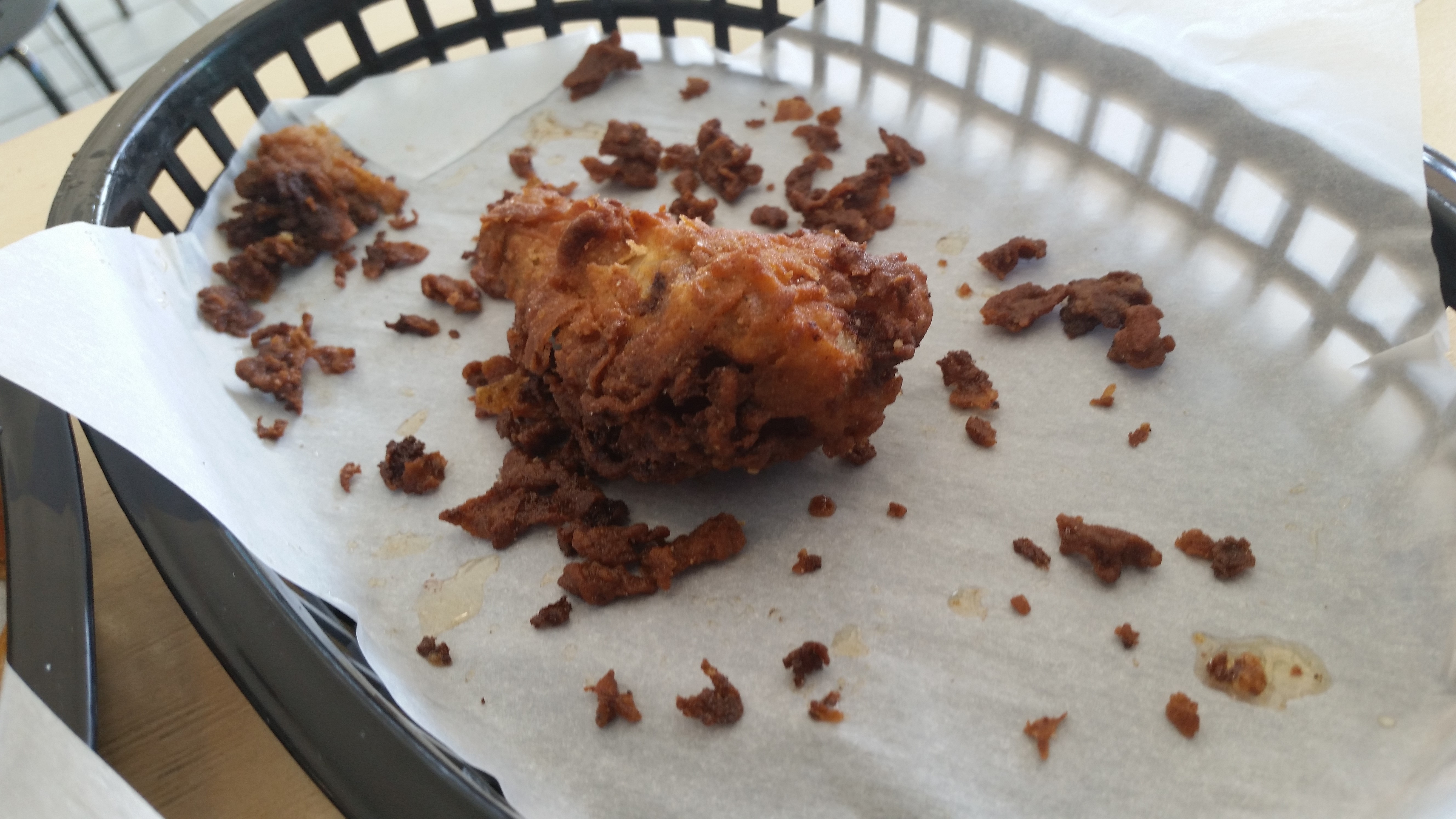 The meat was juicy, the breading was thick and the skin was crispy. The coating was flavorful and not too greasy. The skin was the best part as it should be with Fried Chicken.