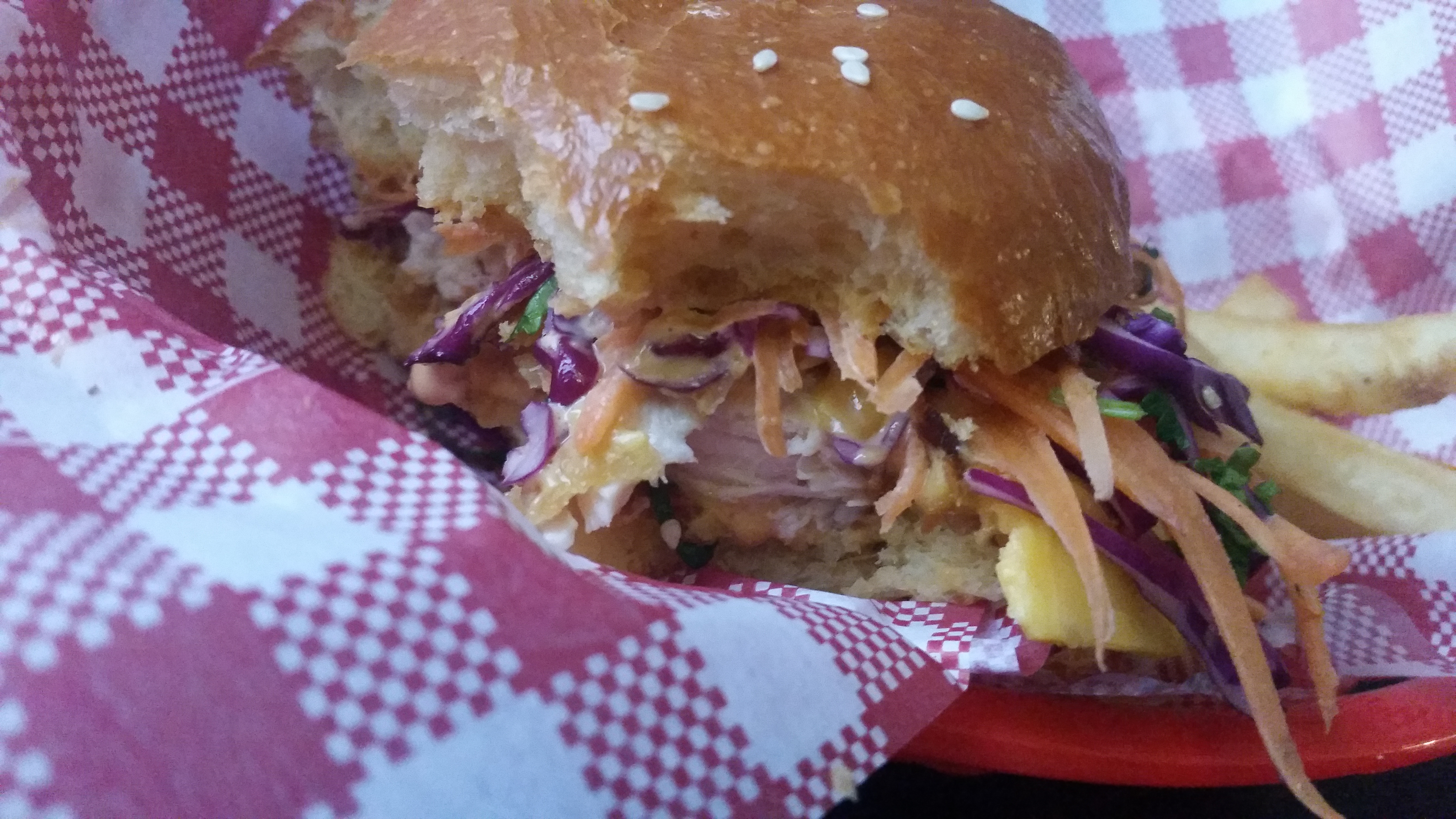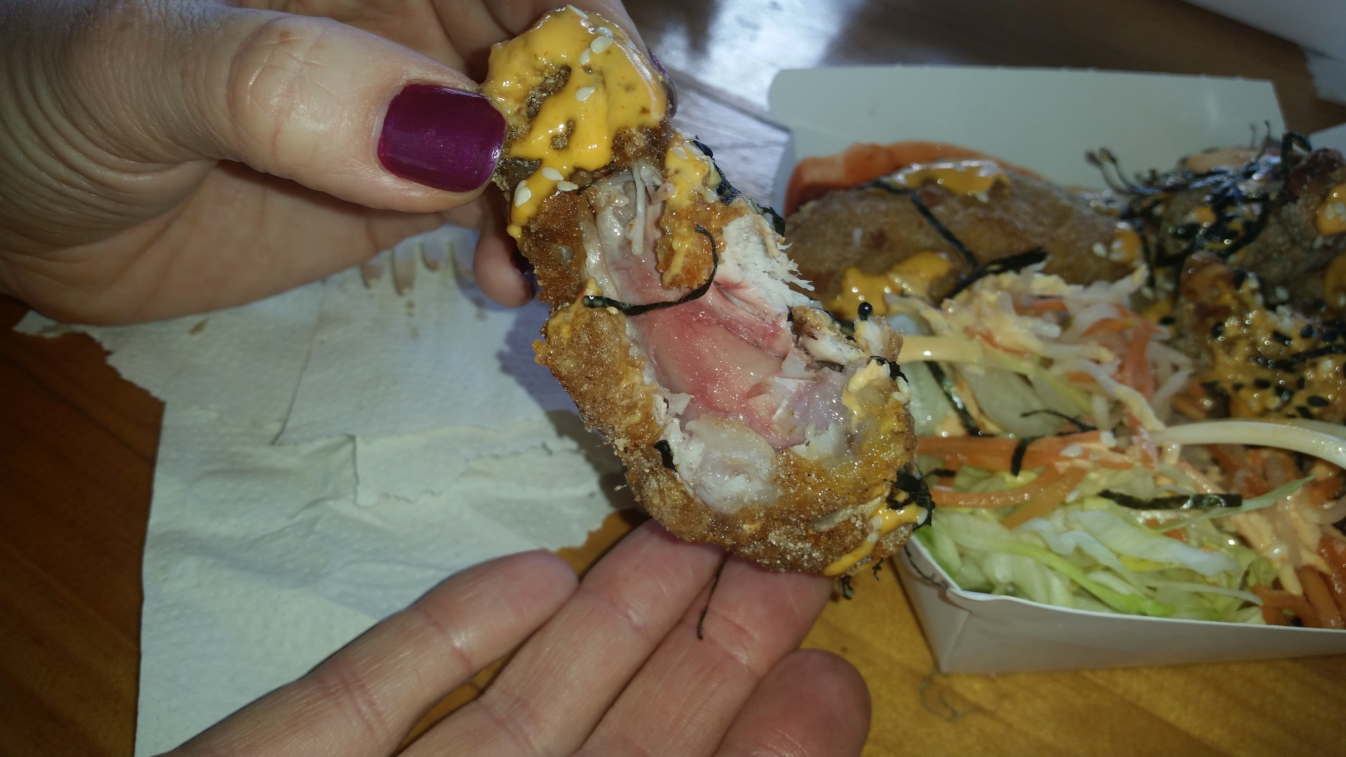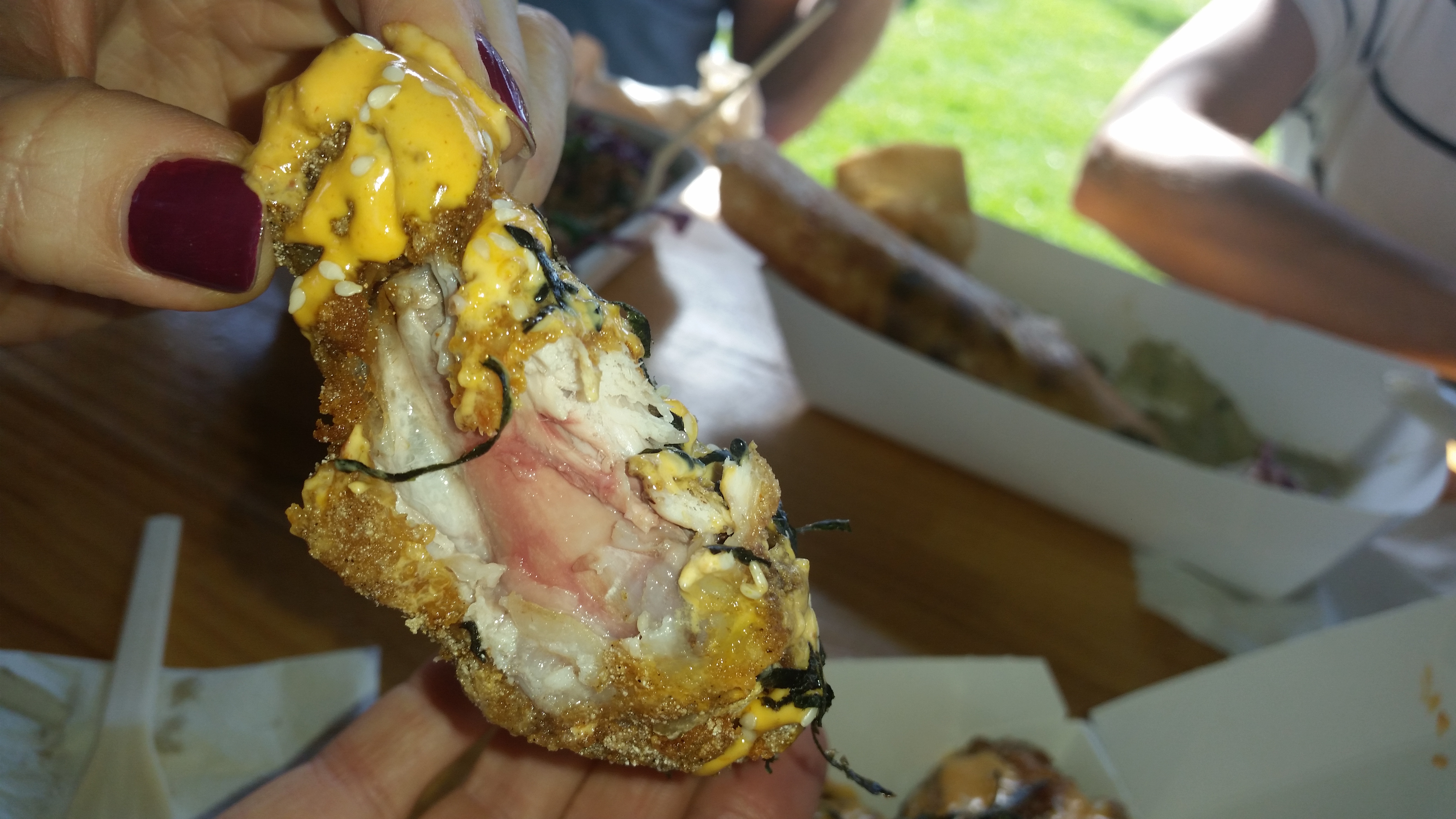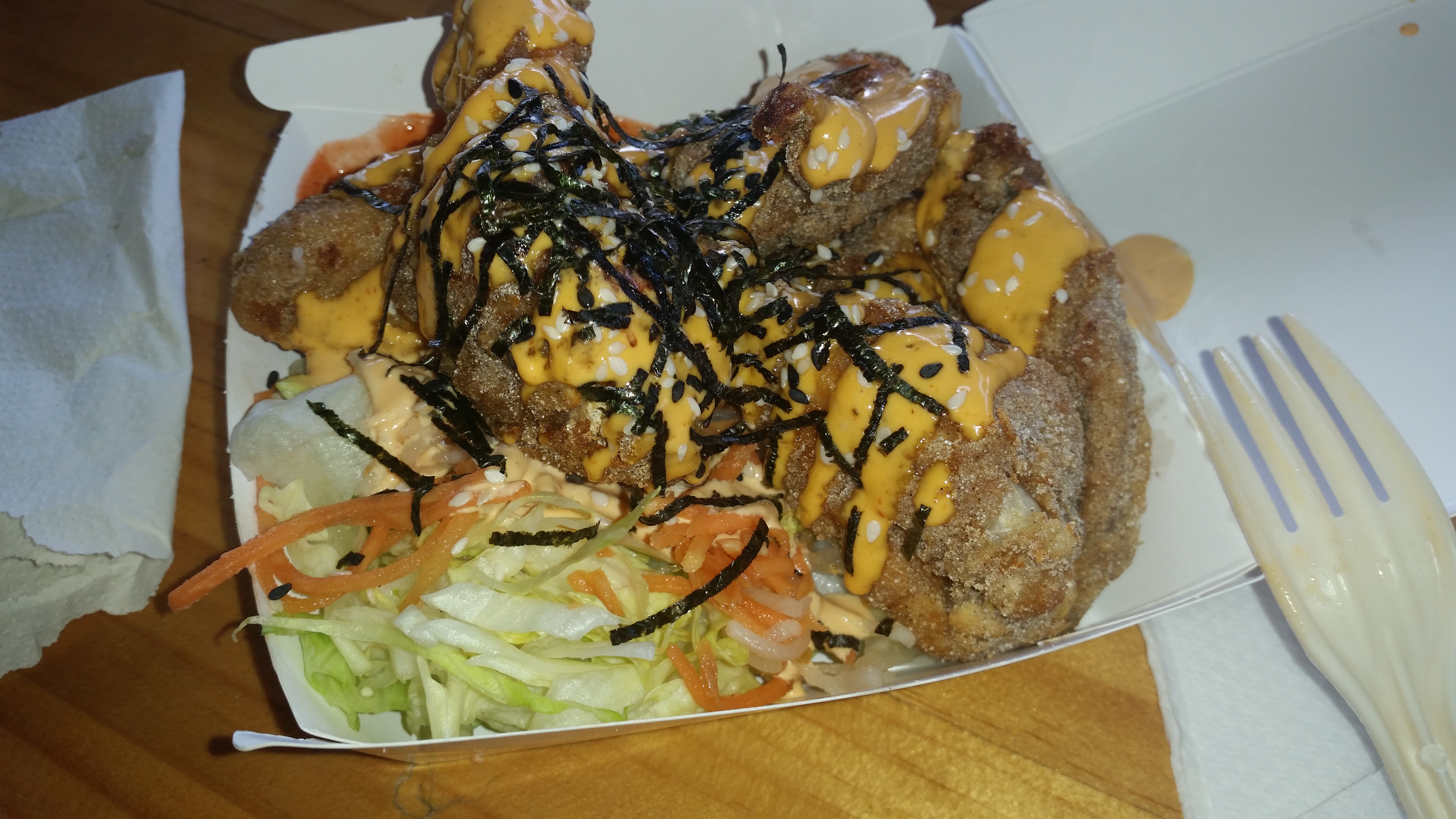 We stumbled up the Korean Fried Chicken Truck in Alma Park in St Kilda East and decided to give it a go. We ordered a serve of the fried chicken pieces which came with a spicy mayo and hot sauce, seaweed that was all resting on a bed of slaw.