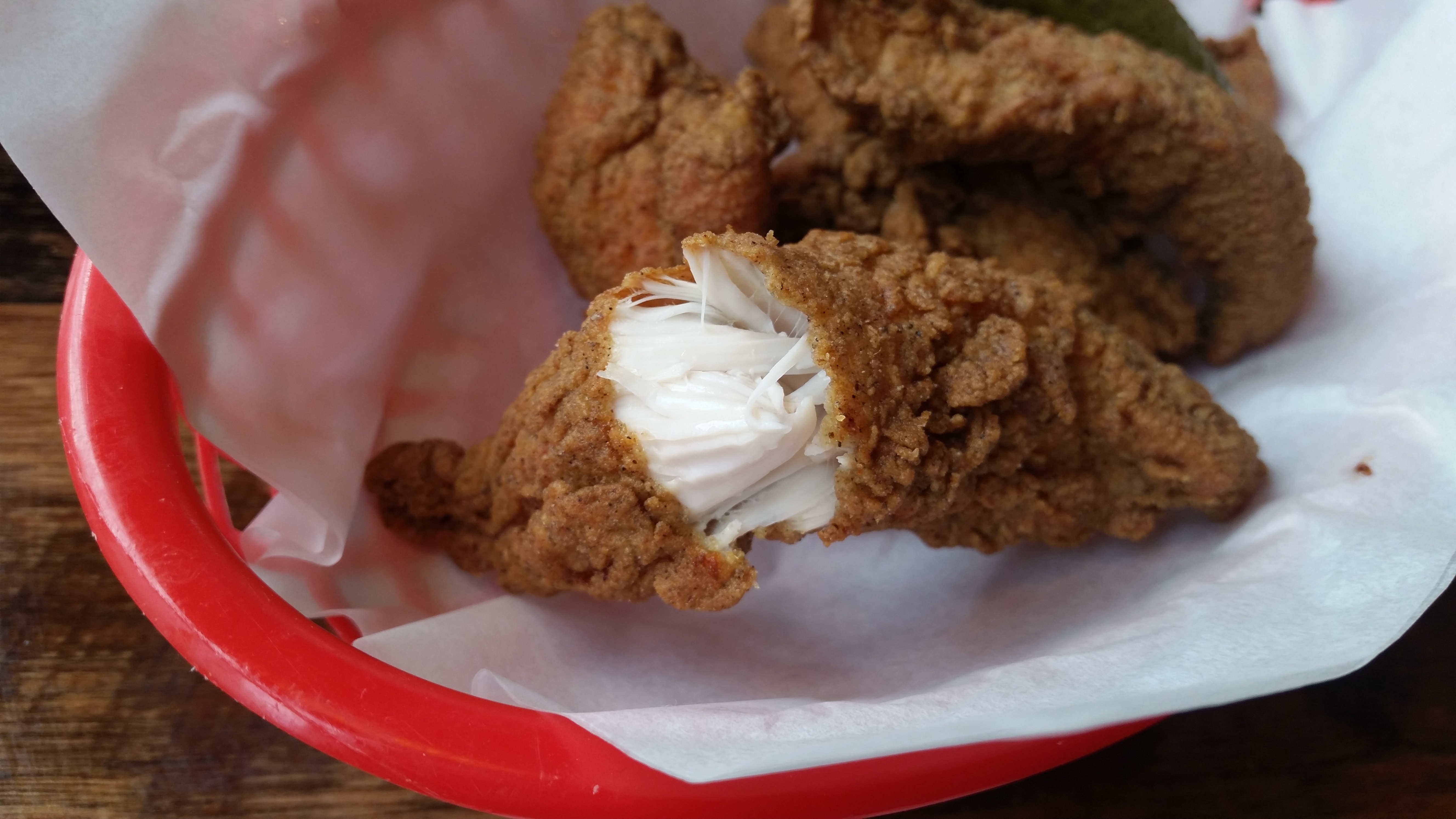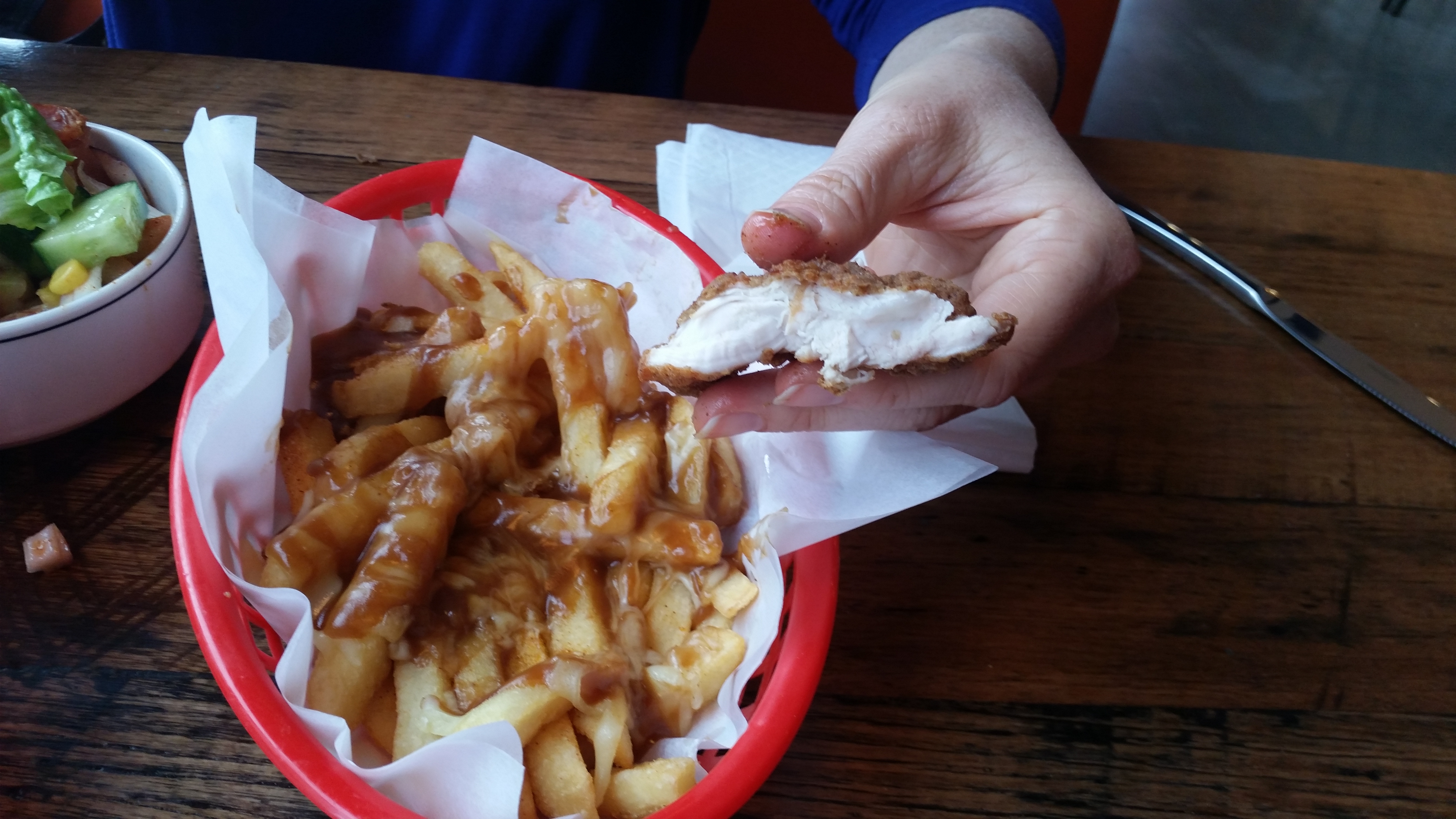 The menu was full of all kinds of fried chooks; pieces, tenders, wings and many burgers. We settled on the tenders and spicy chicken pieces along with poutine and chop salad
