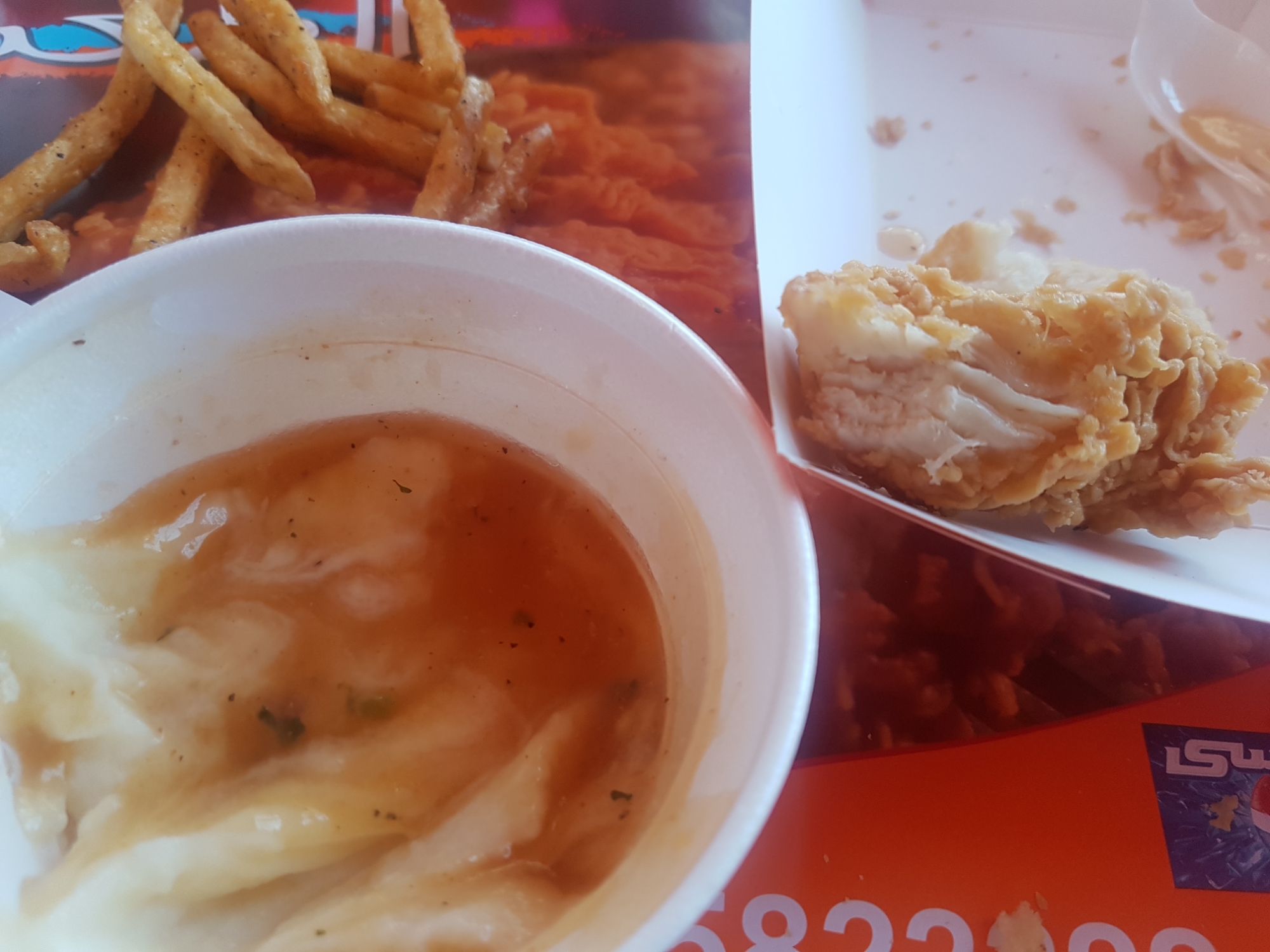 The stars of the show are the mashed potatoe with gravy and the biscuits. The gravy is truely amazing peppery goodness. The biscuits are crispy on the outside and buttery and fluffy on the inside. Combining the two with the chicken is a match made in heaven!