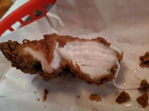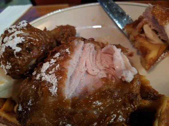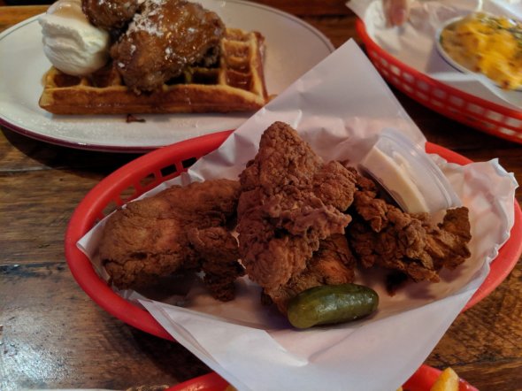 The Chick went for the fried chicken and waffles with a side of Mac-n-Cheese and Hollywood went for the chicken tenders and poutine