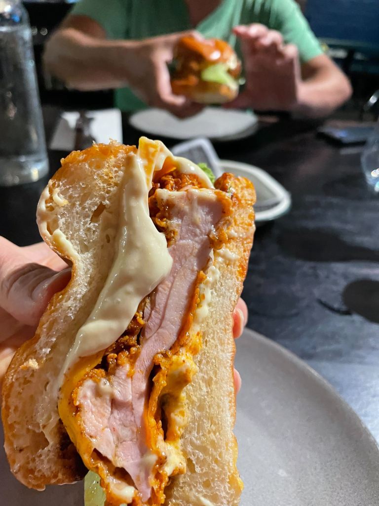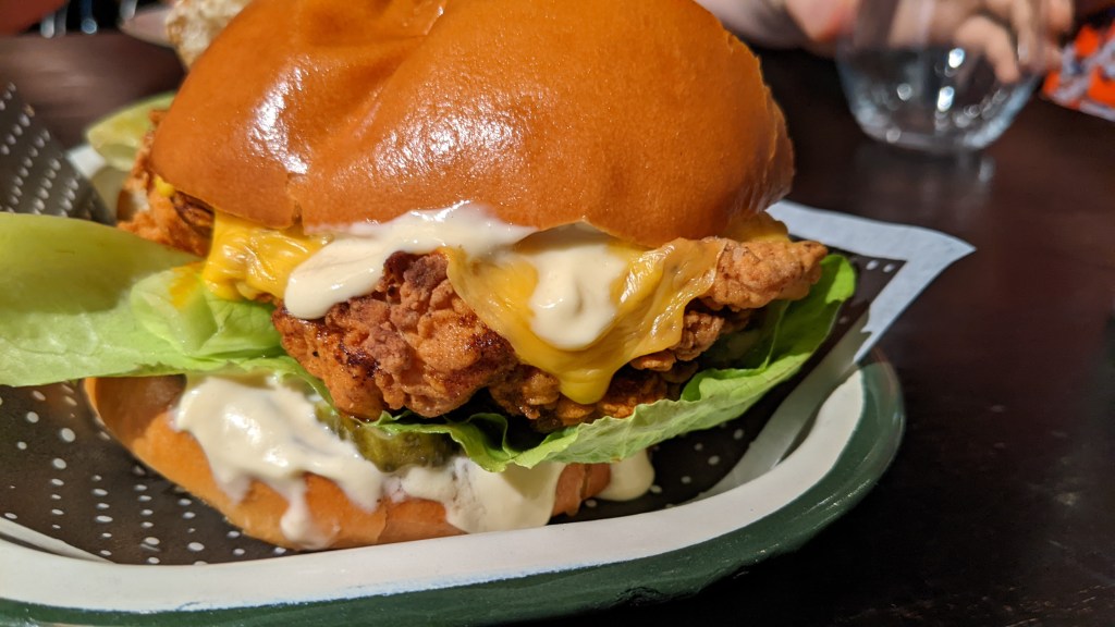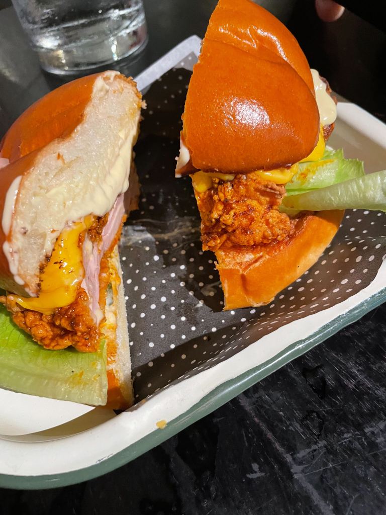 After they are fried they are coated with a thick rapeseed oil and spice mixture to give it an extra kick. The buns used are brioche (which sits really well with Hollywood) and they are accompanied on both sides with a generous amount of housemade aioli. The chicken ends up sitting on some lettuce and pickles and is topped with slightly melted cheese